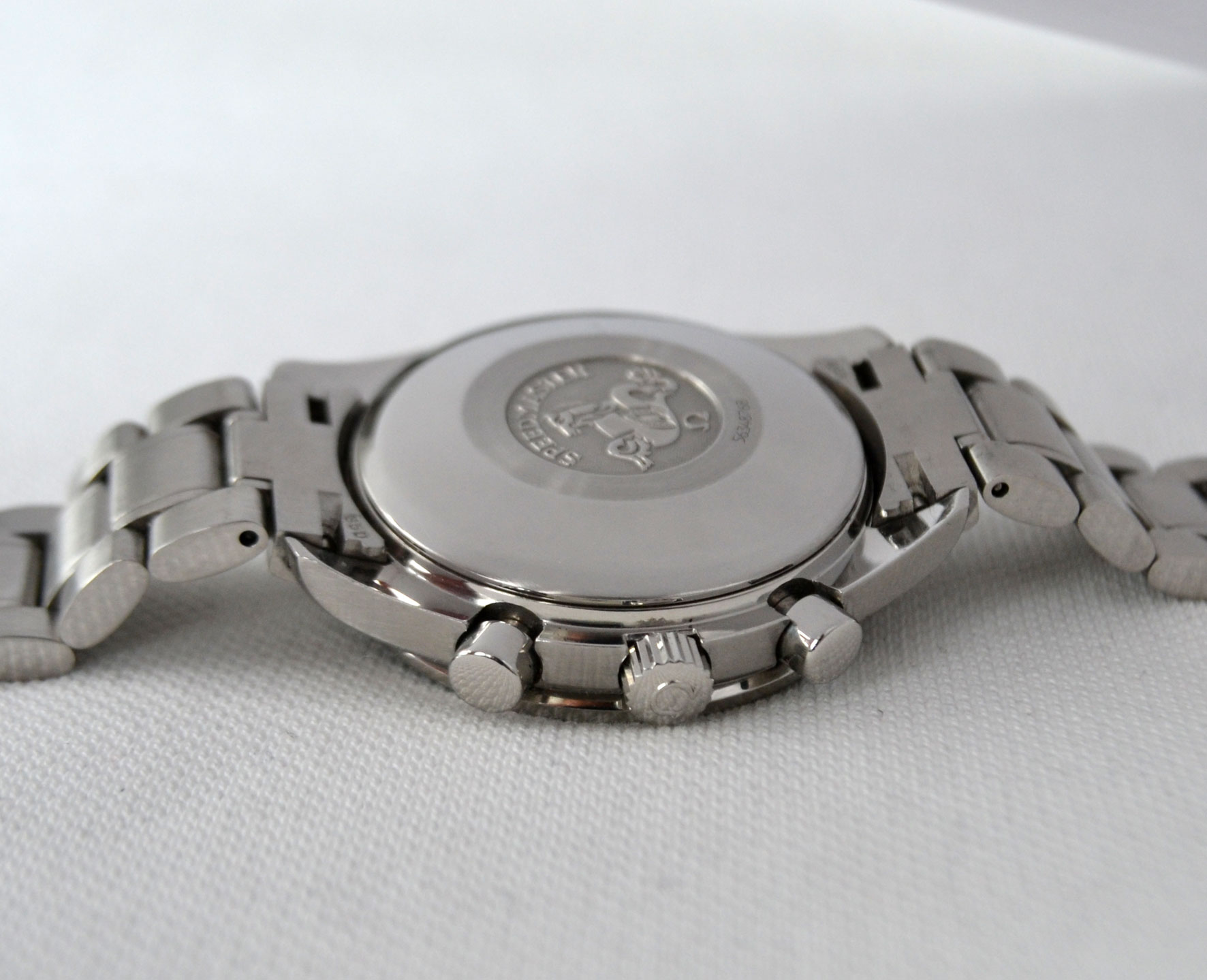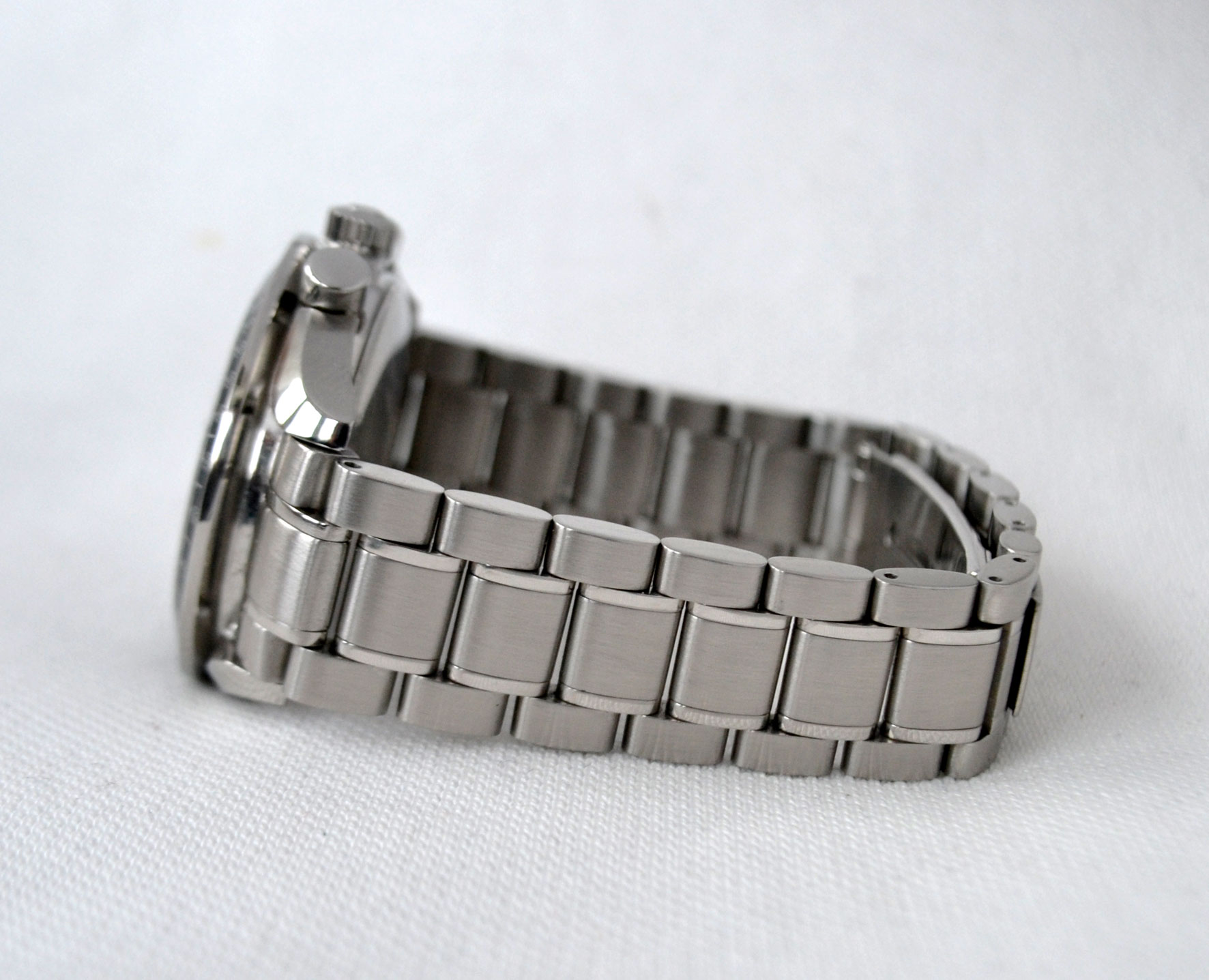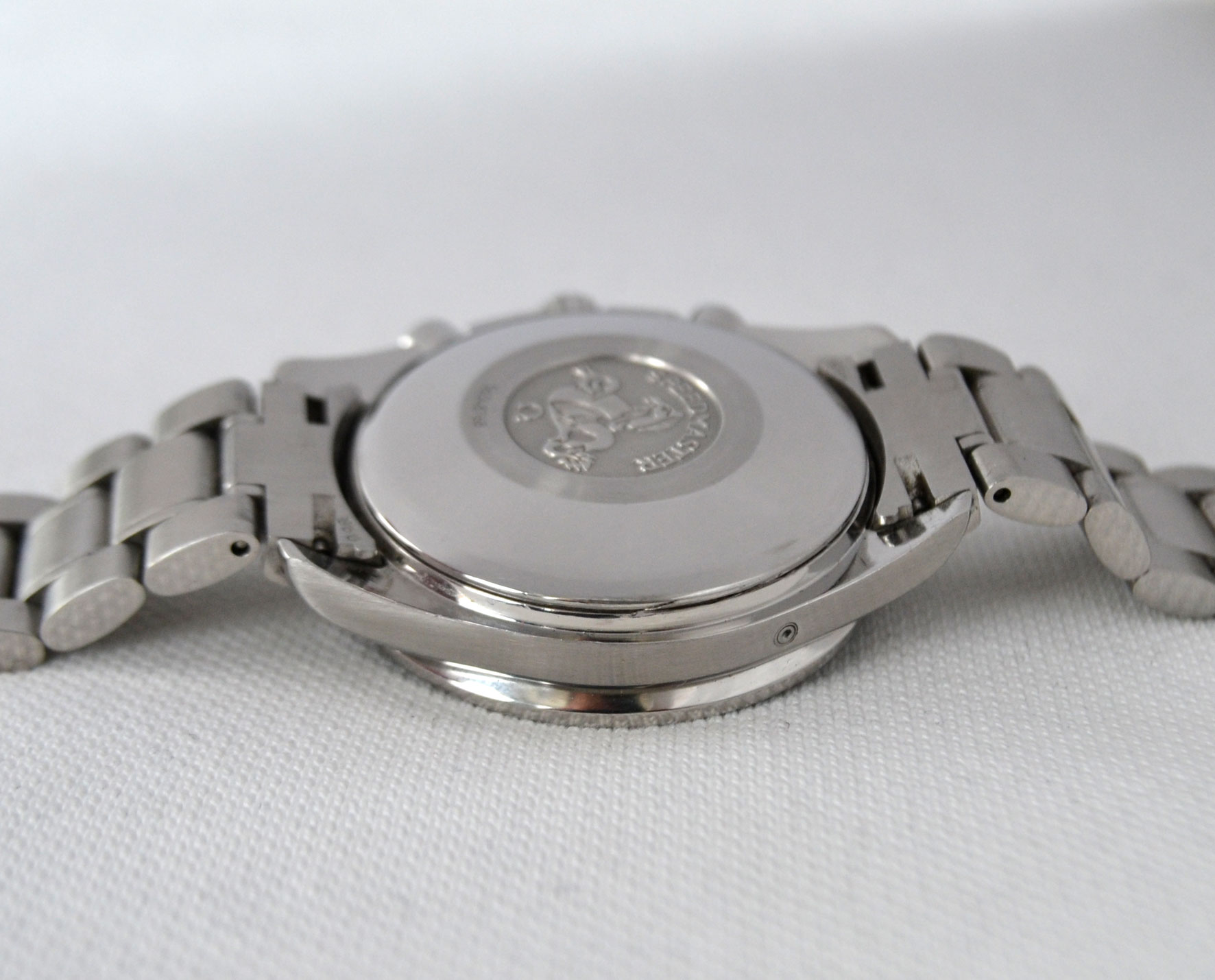 The movement is an original, self winding, 25 jewels Omega cal. 1151. It is in perfect running condition, runs strong – keeps time, all functions properly. The authentic case and sporty bracelet are made stainless steel with a fold-over clasp.